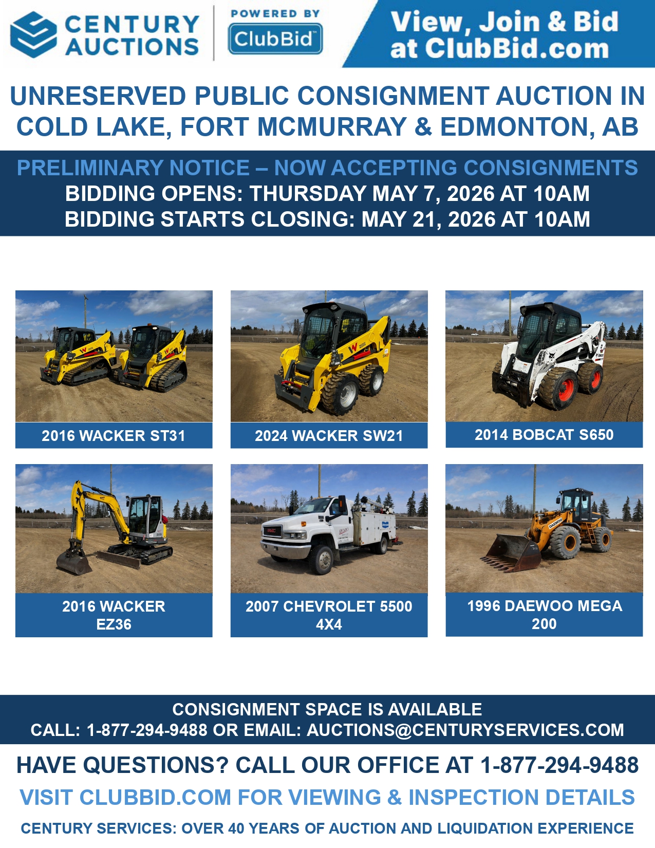 Unreserved Public Consignment Auction in Cold Lake, Fort McMurray & Edmonton, AB