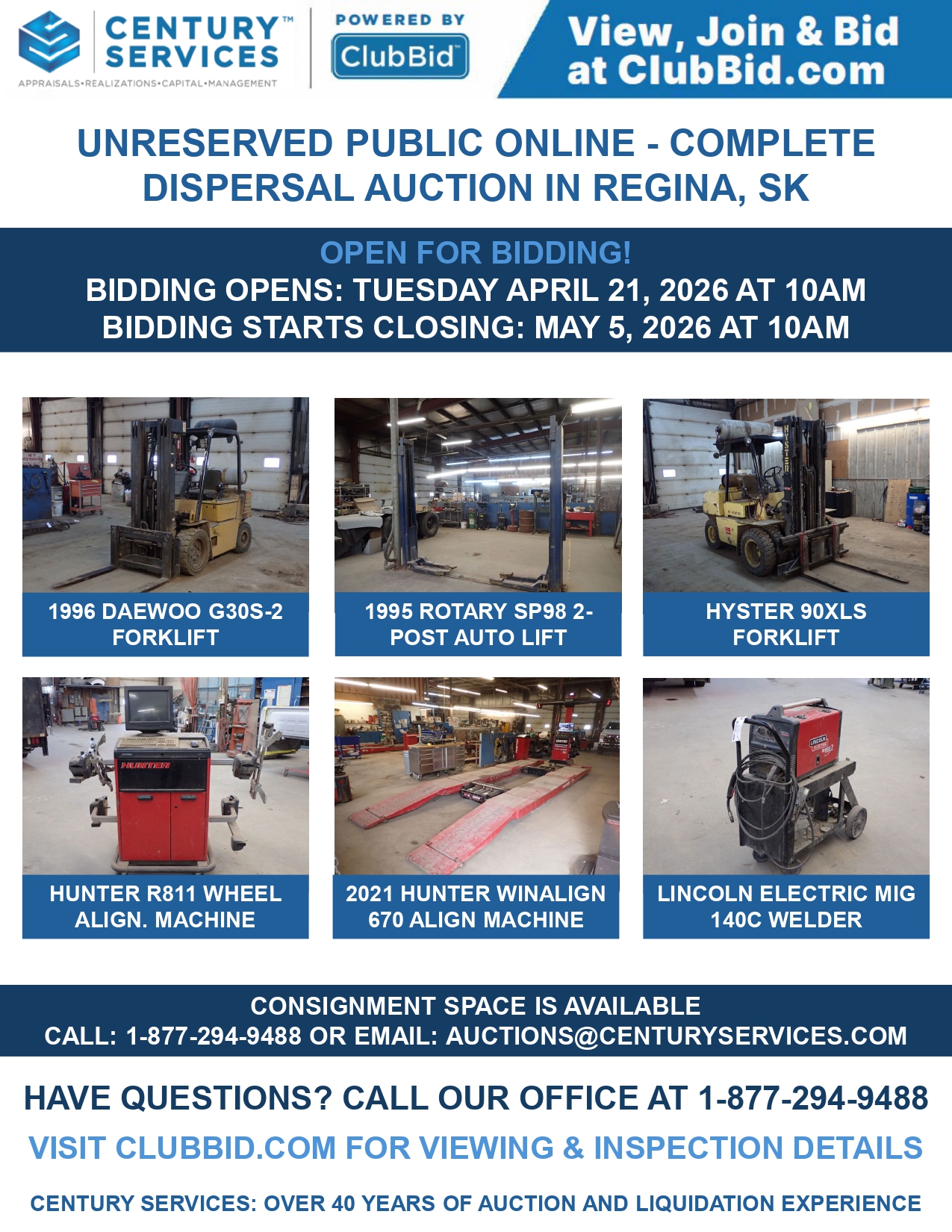 Unreserved Public Online Complete Dispersal Auction in Regina, SK